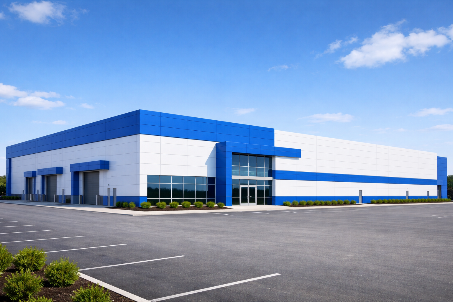 מבנה תעשייה בחיפוי אלקובונד לבן וכחול